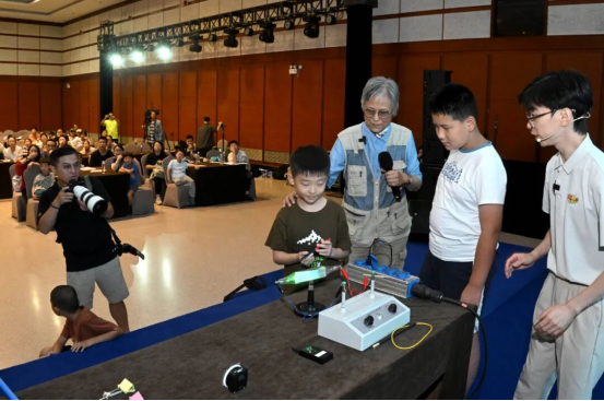 与脱口秀和漫画的超级科普秀相比,“不刷题的吴姥姥”吴於人的酷炫科普实验,更受现场小朋友们的热烈欢迎。用磁铁让绿色的光路发生偏转,用晃动的吊线模拟涡振让大桥如面条般扭动的真实案例,用旋转的车轮让学生感受陀螺仪对保持空中稳态的作用……每一个精心设计的物理实验开始展示时,现场小朋友就会目不转睛盯着看;当要求小朋友上台参与实验时,台下顿时升起了密密麻麻的小手;科学实验课结束之后,一大群小朋友冲上台,自觉排队等着来亲自实验一把。